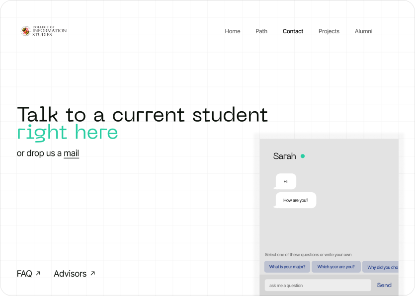 The ischool website could have a chatbot through which the prospective students could talk to students currently enrolled in the required major, helping the former to get information about the major from someone around their age. They could get their doubts resolved and talk to someone on a more casual level.
