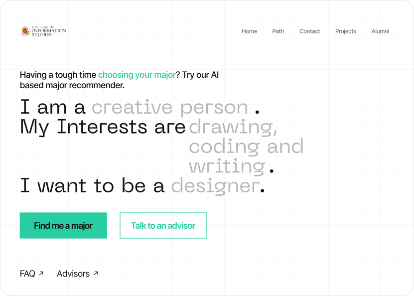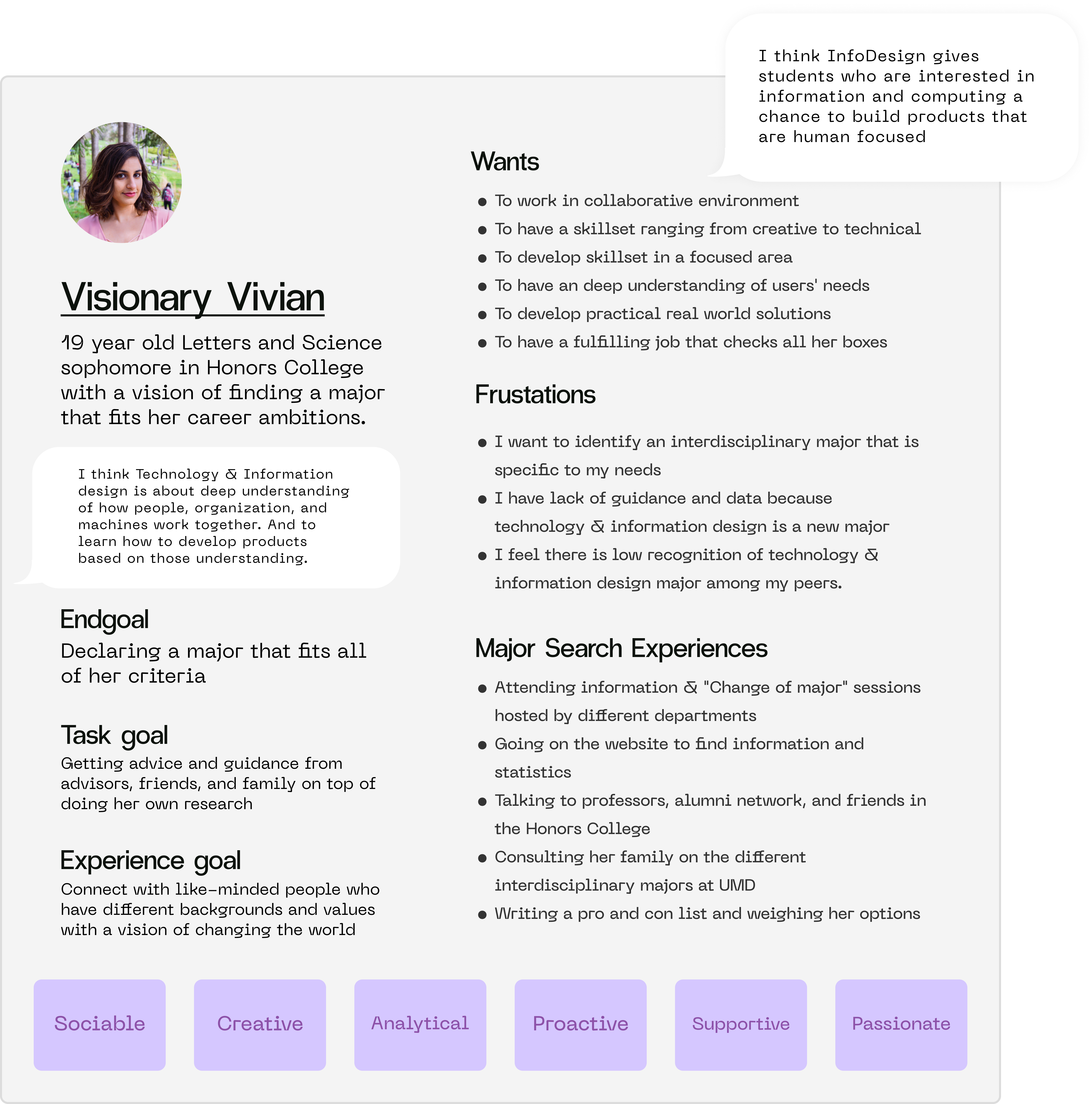 The College of Information Studies at the University of Maryland wanted us to conduct user research through conceptual design and modeling to create a defined brand identity and messaging for a new upcoming major, Technology & Information Design.