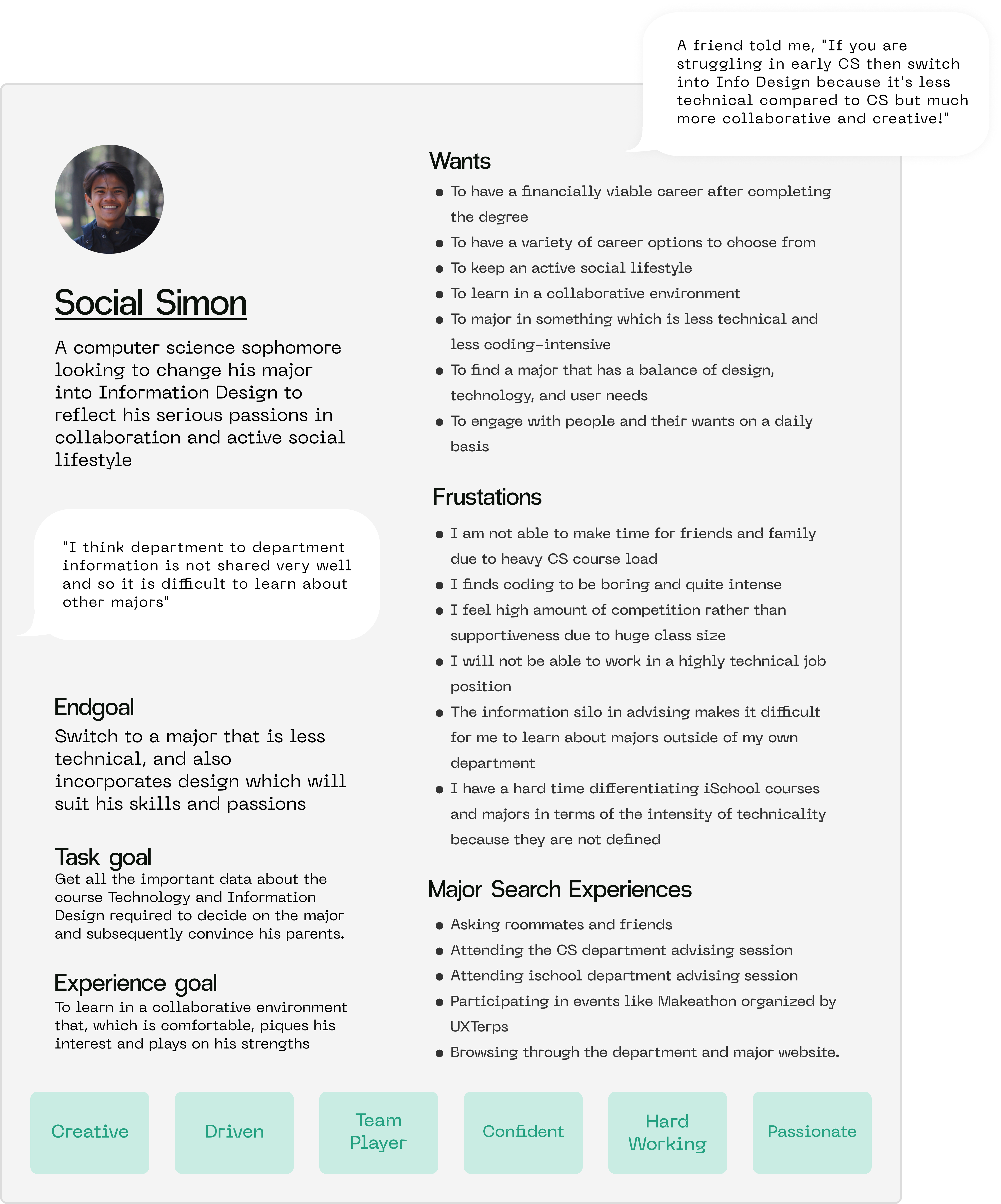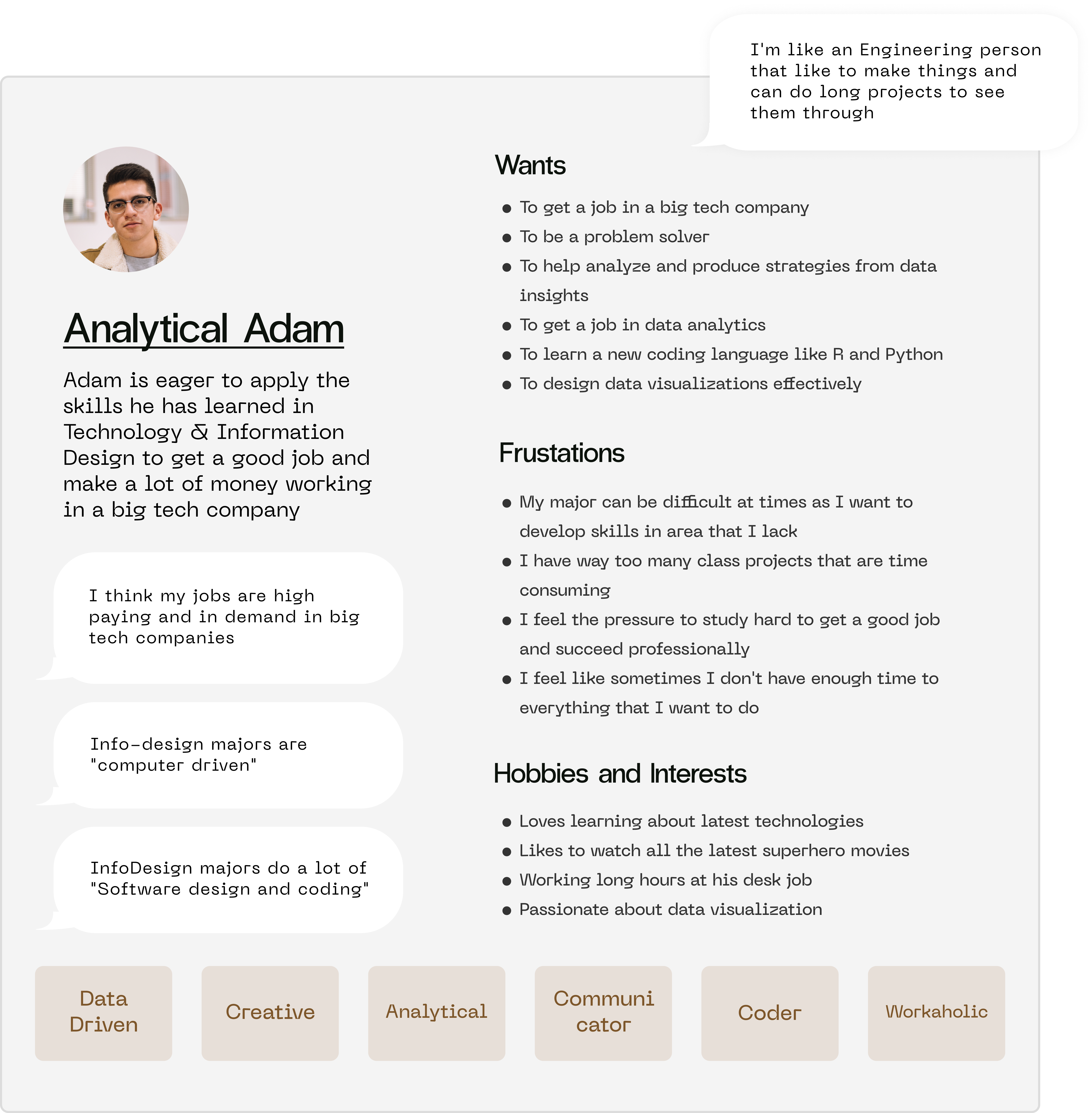 Adam was termed as the “perception persona”, which represented the perceptions that people who were not affiliated with the iSchool held of a person who may want to enroll in the Information Design program. Interestingly, the two sets of personas turned out to be starkly different from one another, and we determined that an actual student pursuing this major would realistically fall somewhere between these two sets.