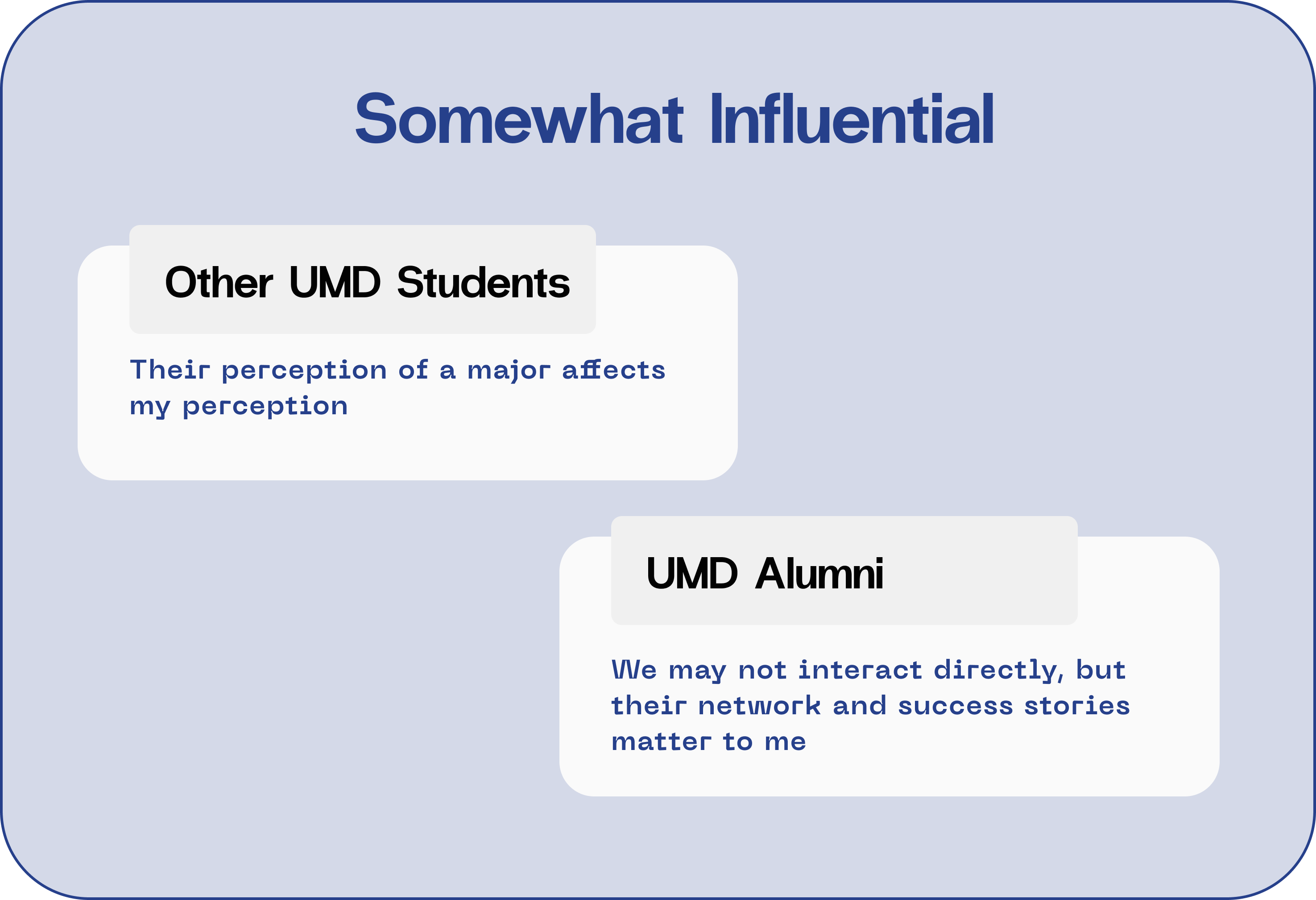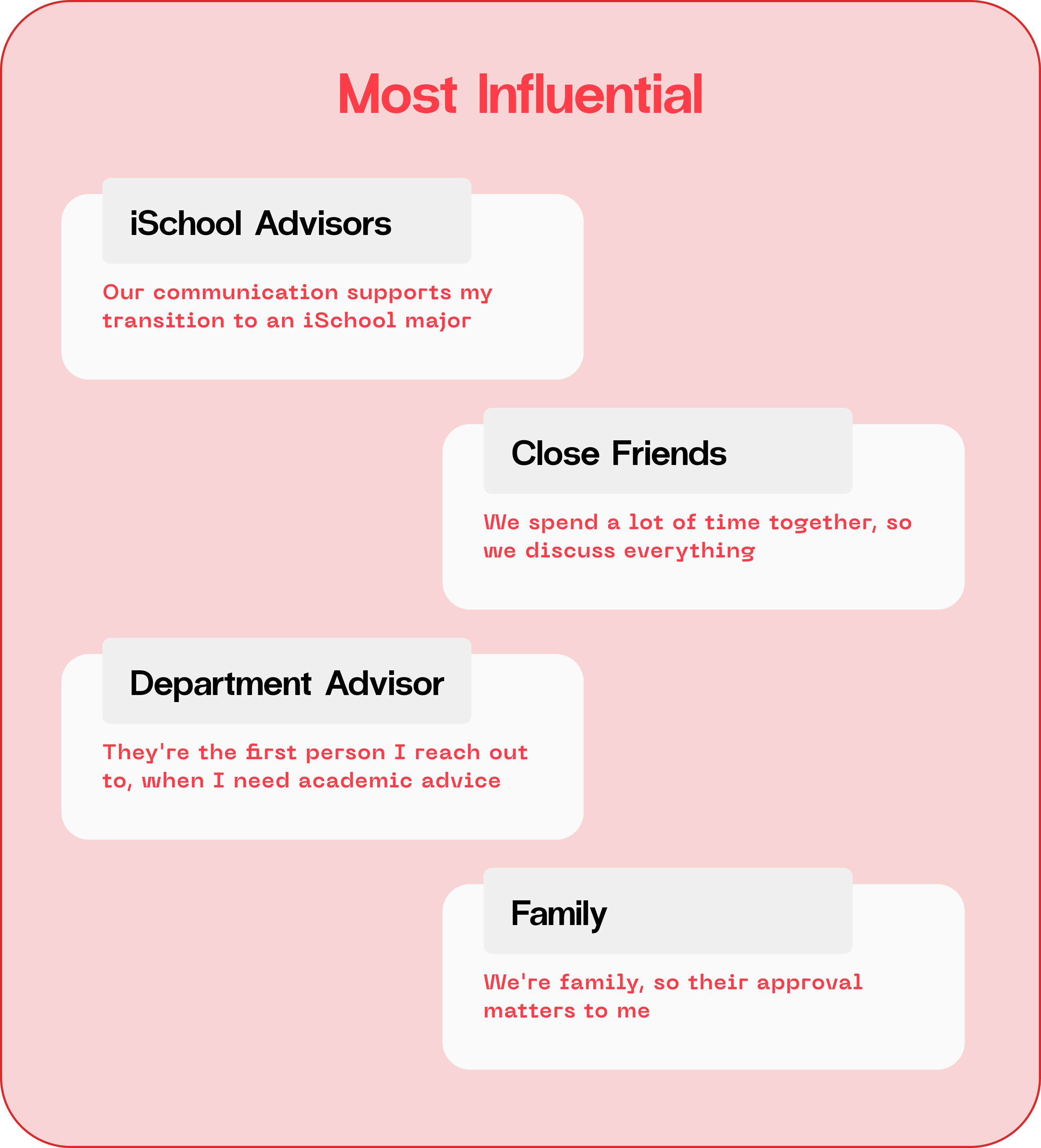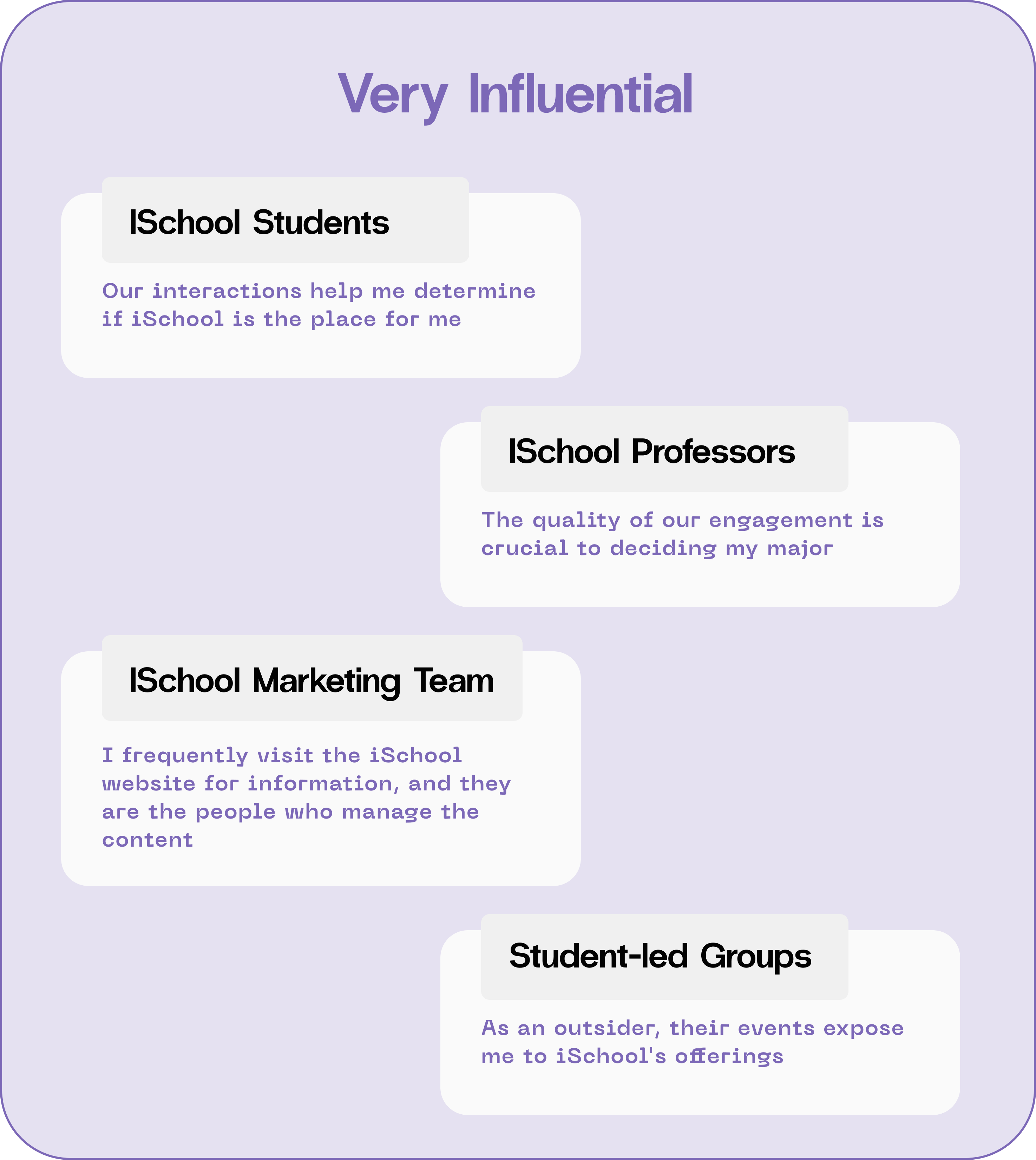 Through the various interviews we conducted with the current iSchool students, we determined that prospective students’ decision to enroll in a major was influenced by other people.These insights led us to employ a Relationship model, so as to explore the many ways as well as the degree to which different key people/groups of people influenced the decision of prospective students to commit to an iSchool program.